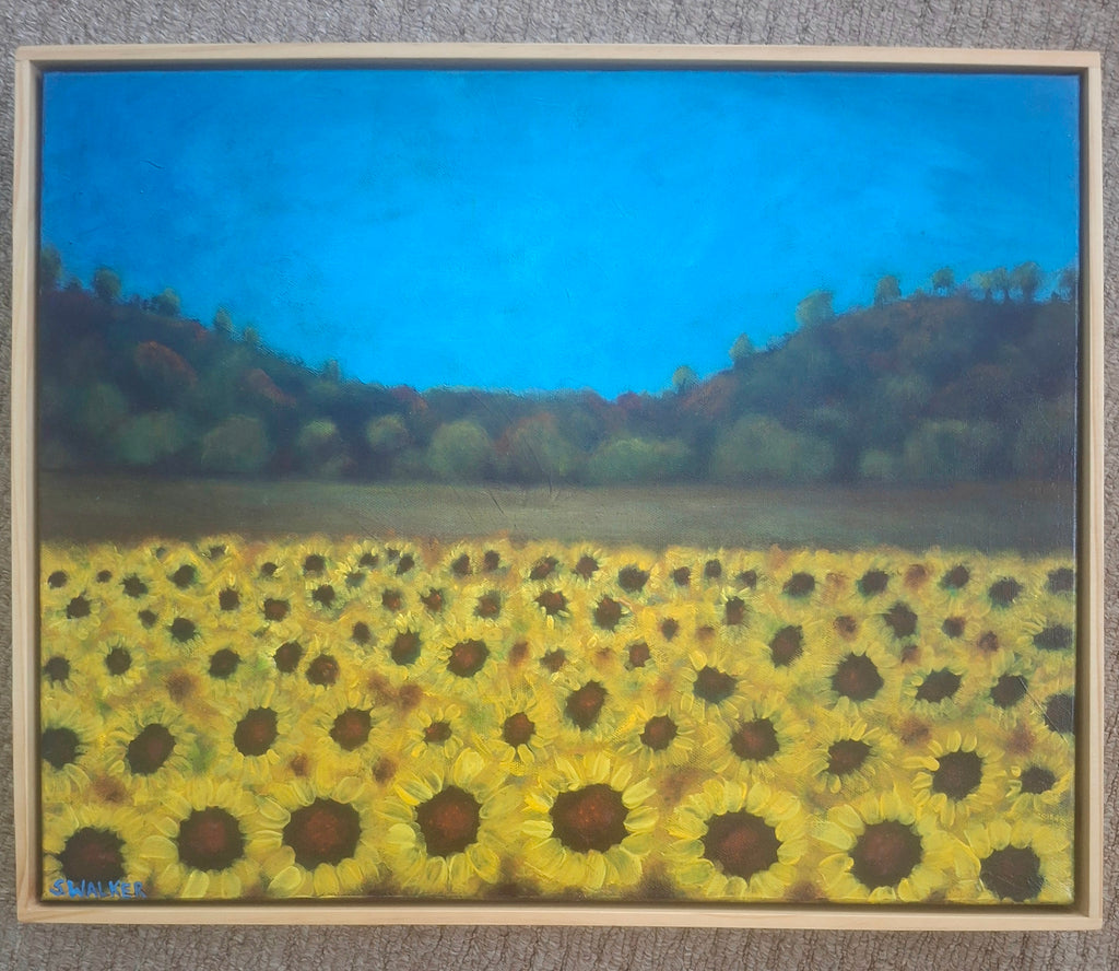 I had to capture this on canvas, the pristine blue of the sky, the burnt colours of the background trees, and the golden faces of a million sunflowers following the sun across the sky.
